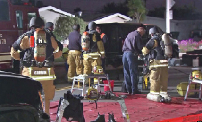 Hazmat, bomb squad crews and FBI agents were searching a home Monday in Costa Mesa, Calif. after a man blew himself up in his front yard Sunday.